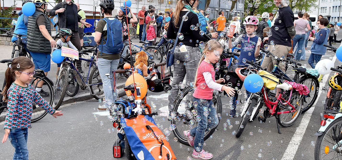 Bunte Luftballons flattern im Wind, fröhliches Lachen und viele, viele Kinderräder